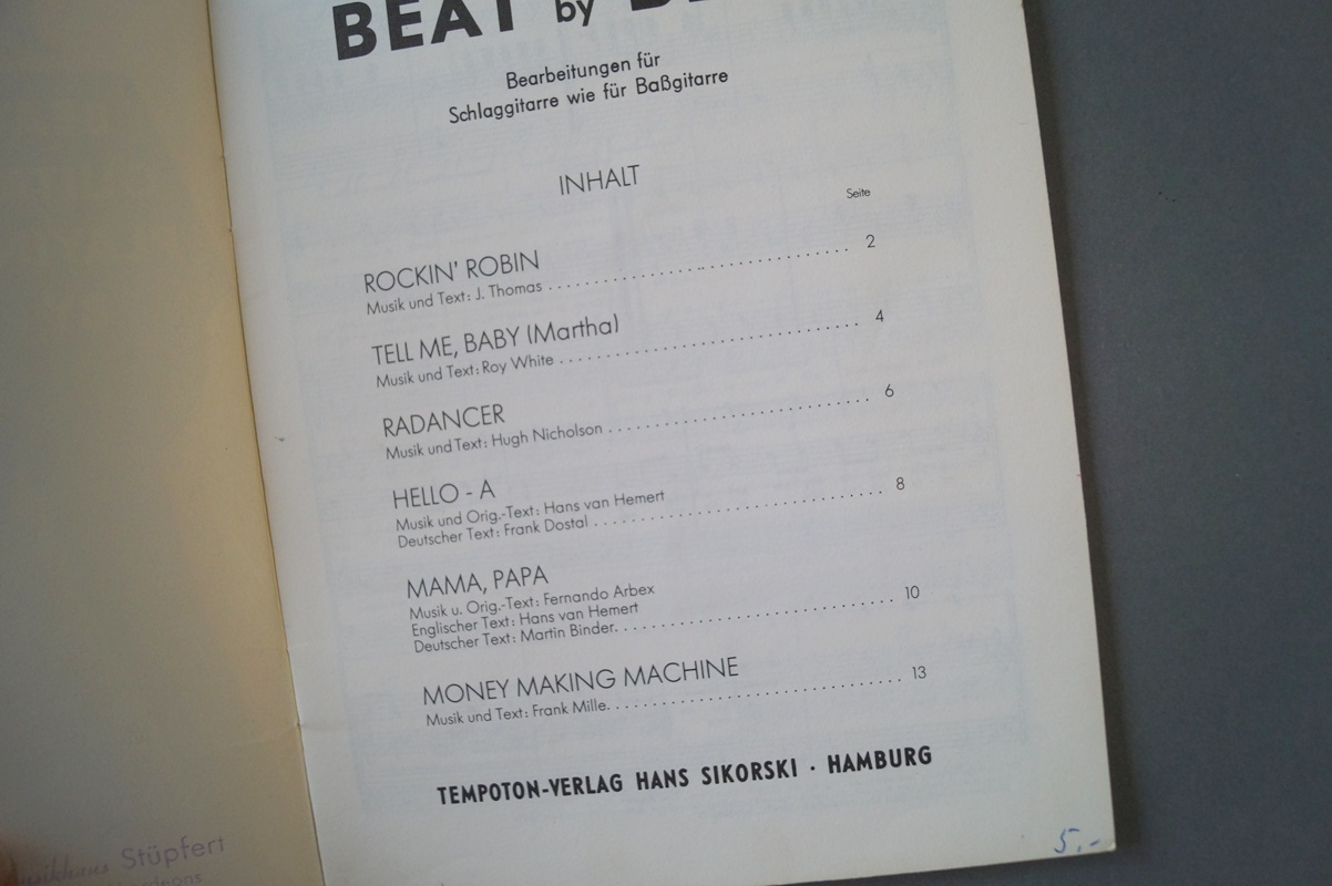 Schauen Sie sich auch bitte die weiteren Fotos an, diese enthalten die Aufstellung der Titel dieses Heftes/Buches sowie eine Beispielseite der Notation.